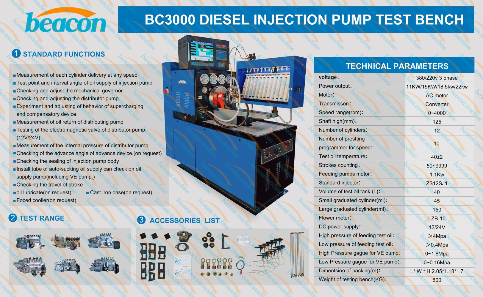 Испытательный стенд для дизельных топливных насосов BC3000 имеет 12 цилиндров и оснащен монитором, компьютерным дисплеем и может тестировать все виды механических насосов, насосов EURO II, традиционных насосов и линейных насосов.