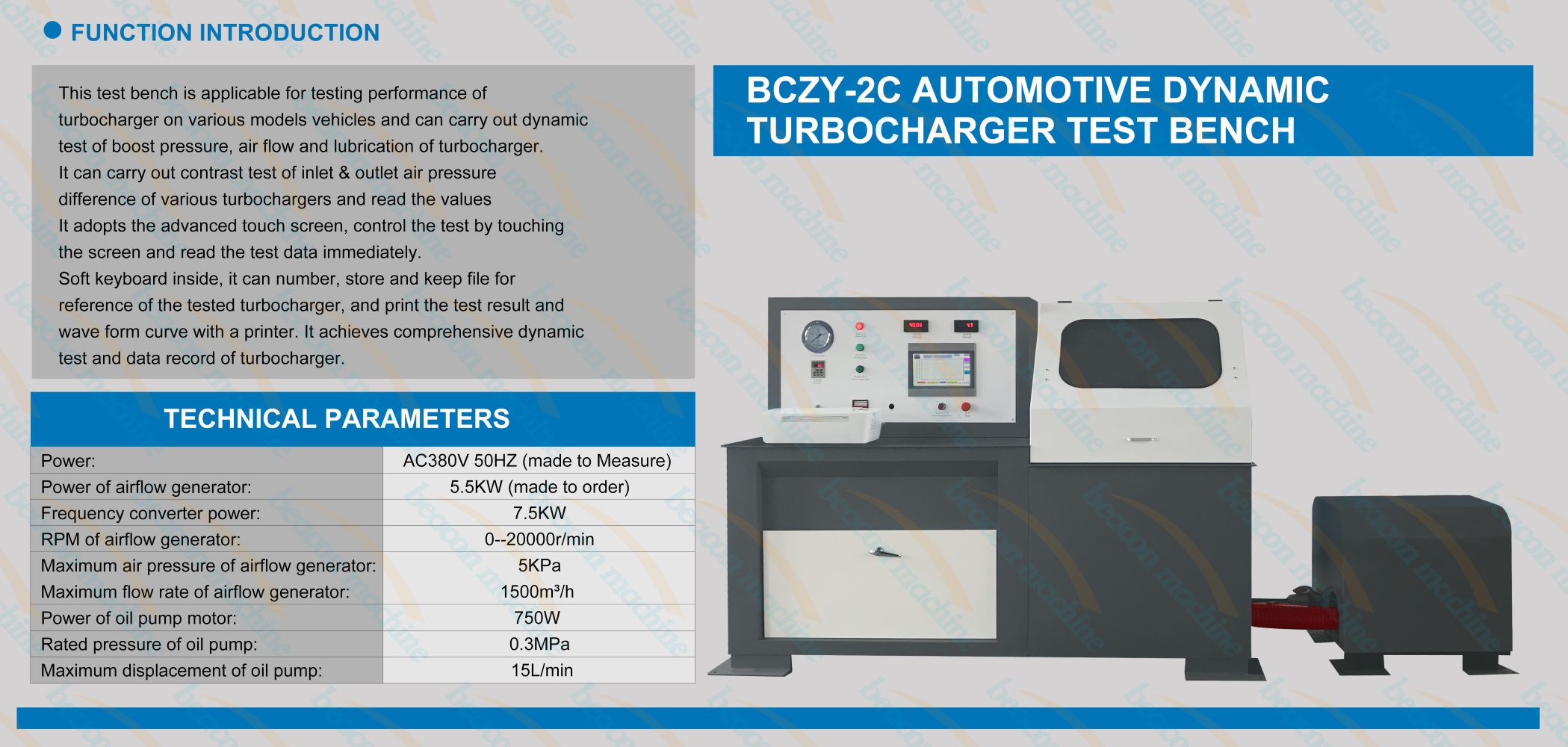 Испытательный стенд турбокомпрессора BCZY-2C может регулировать многие эксплуатационные испытания турбокомпрессора двигателя, включая давление воздуха на входе, давление выхлопных газов, пропускную способность выхлопных газов и скорость турбины. Этот продукт использует генератор воздушного потока высокого давления, частотный регулятор, комбинированный датчик скорости и расходомер передовой технологии, а метод синтеза оборудования может продвинуть уровень в Китае.