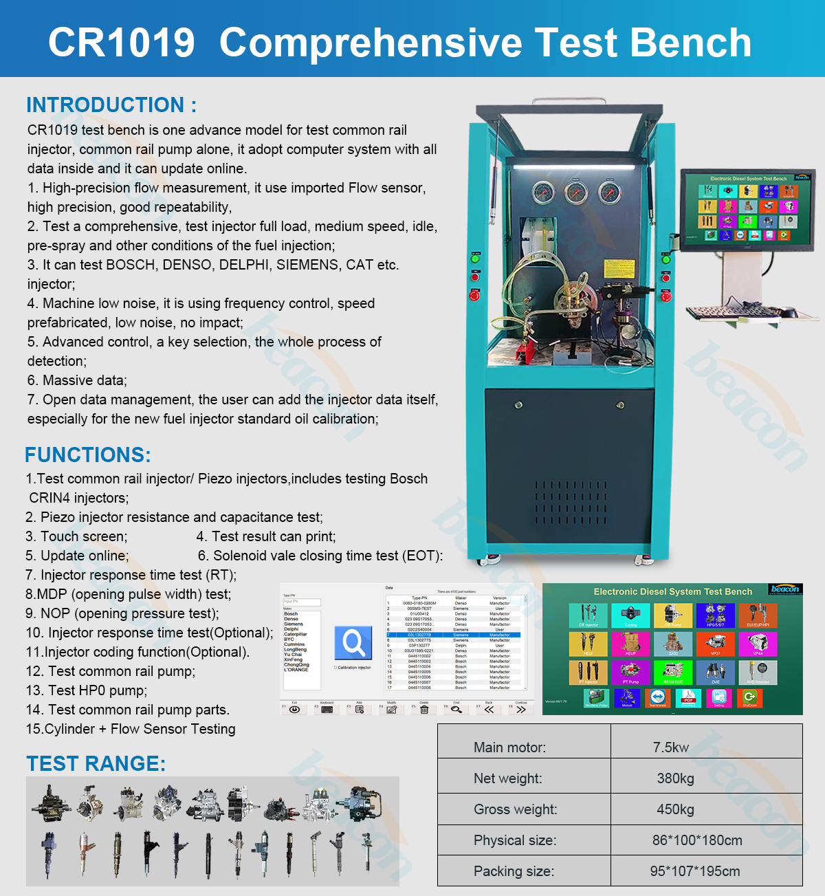 Стандартный испытательный стенд для инжекторов и насосов CR1019 позволяет проверить инжектор с помощью датчика расхода инжектора, а также с помощью стеклянной чашки, проверить насос с помощью датчика расхода насоса