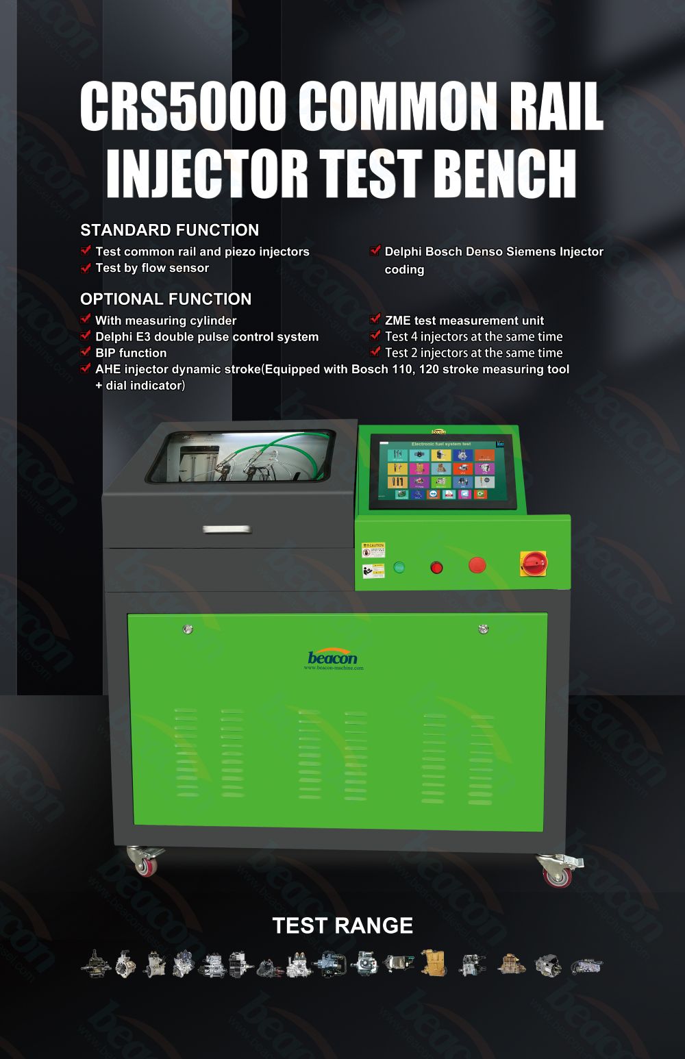 CRS5000 COMMON RAIL TEST BENCH в основном предназначен для тестирования инжекторов Common Rail. Также это компьютеризированная измерительная система непрерывного анализа подачи топлива для обычных и новых систем впрыска дизельного топлива. Электронная система измерения подачи топлива является обязательной для тестирования современных систем впрыска дизельного топлива. Она гарантирует высокий уровень воспроизводимости измеренного значения