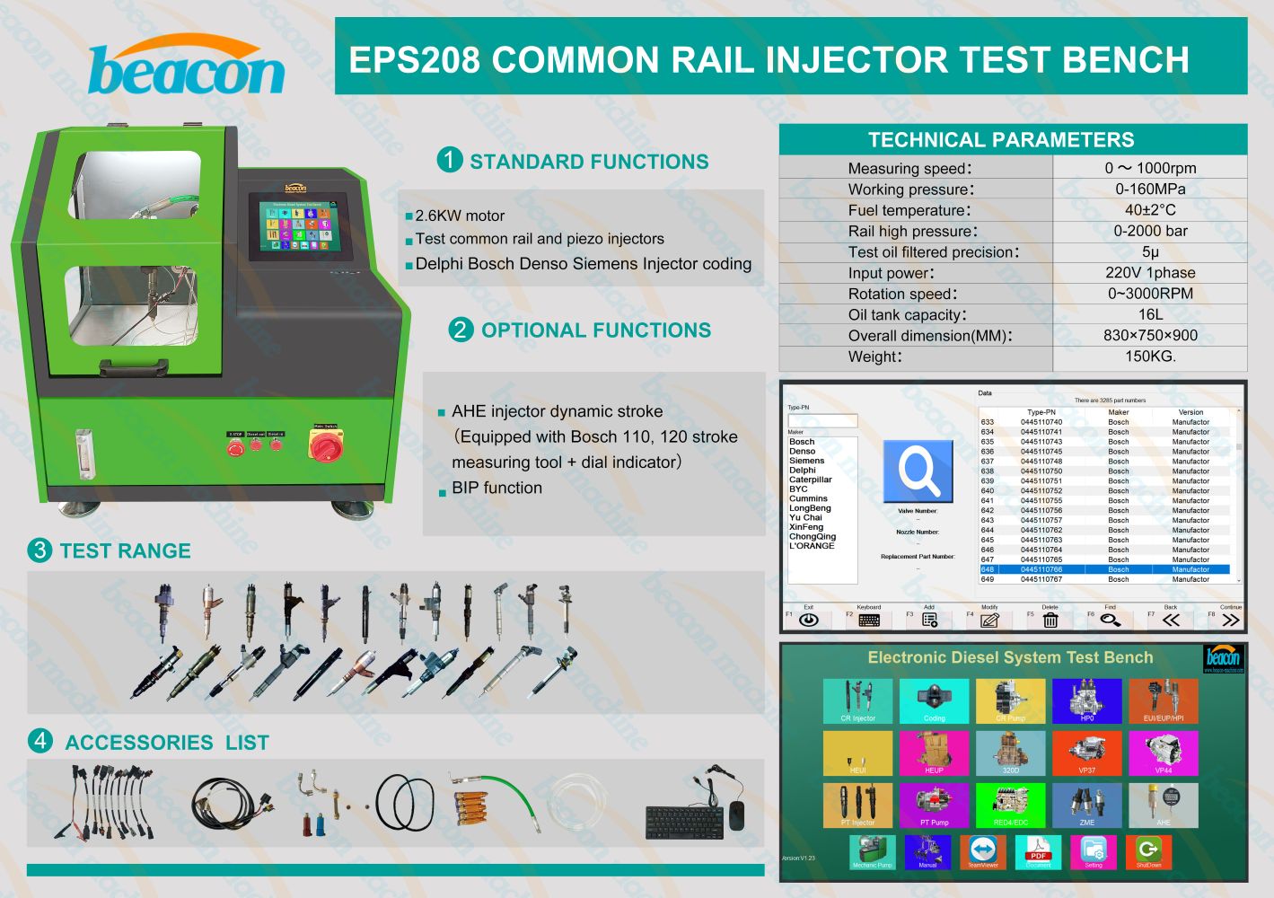 Испытательный стенд EPS208 для форсунок Common Rail может проверять все виды форсунок Common Rail и пьезоэлектрических форсунок Bosch, Denso, Delphi, Siemens, VOD и т. д., а также выполнять функцию кодирования форсунок