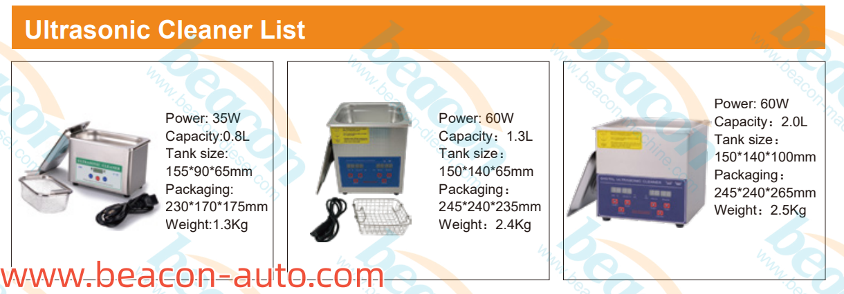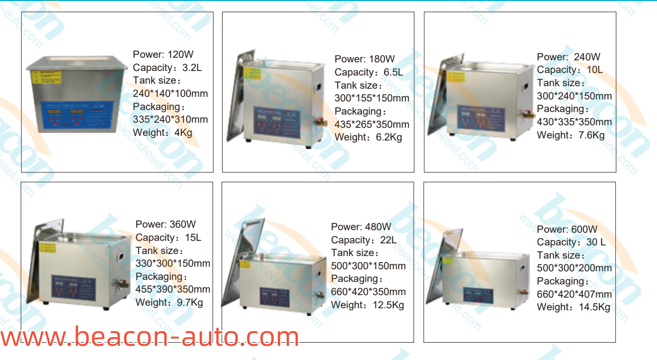 Мы можем предложить ультразвуковые ванны для очистки различных размеров и объемов, используемые для очистки дизельных форсунок, насосов, деталей двигателей и т.д. Доступны модели объемом от 0,8 до 1500 литров.